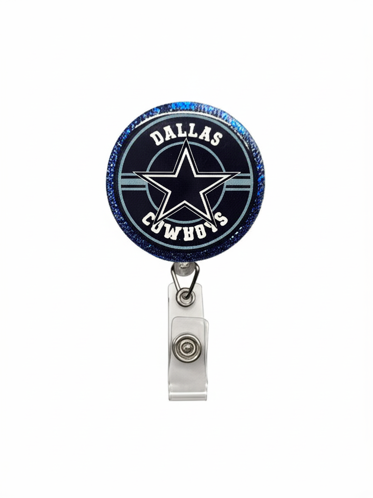 A circular Dallas Cowboys badge reel featuring a vibrant, full-color Dallas Cowboys star logo at its center. The badge reel has a durable plastic casing in the team's signature navy blue. The retractable cord extends smoothly, allowing easy access for scanning ID cards or keys. The back of the badge reel is equipped with a 360-degree rotating alligator swivel clip, providing a secure and flexible attachment point to a belt loop, pocket, or lanyard. This design ensures the logo remains upright and visible, no matter how it's clipped on.