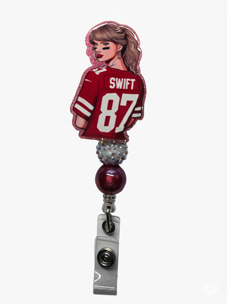 A Taylor Swift badge reel with an alligator swivel clip is a retractable ID holder designed for "Swifties" in professional settings, such as healthcare, education, or office environments. The reel combines a practical function with fan-inspired aesthetics, making it a popular accessory.