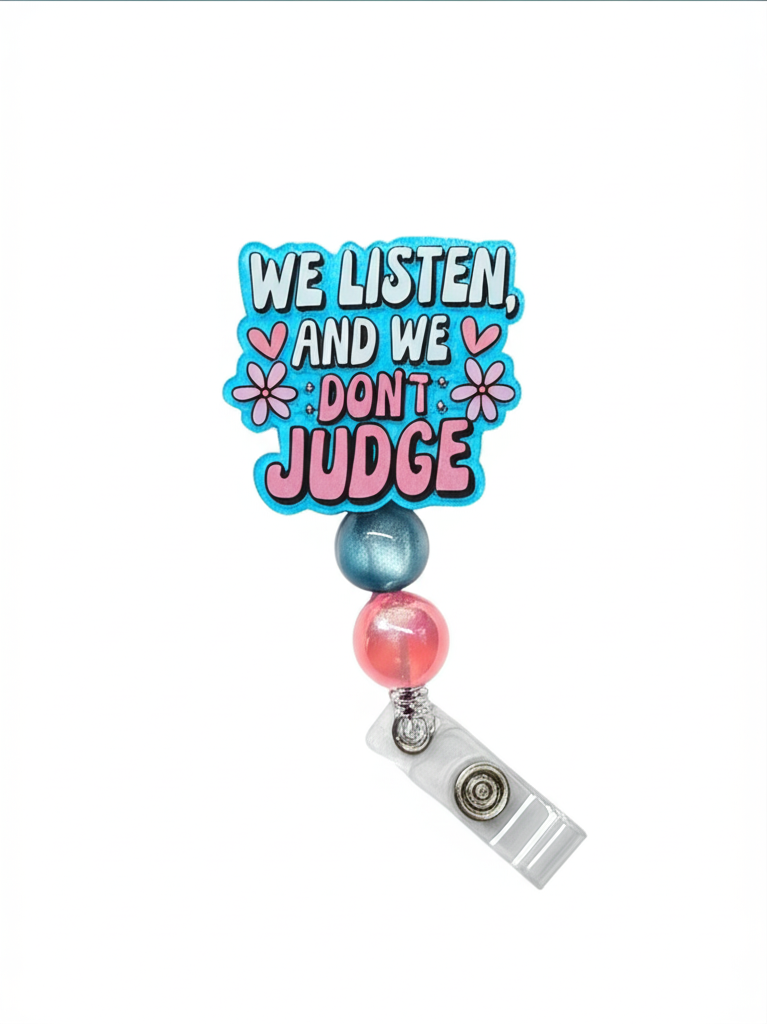 Behold, the badge reel that's seen it all. This isn't just a holder for your ID; it's a tiny, truth-telling guru for your waistline. With the words "We Listen And We Don't Judge" emblazoned on its face, it’s a silent promise to all who approach. The retractable cord isn't just for reaching the card reader—it's for those long, dramatic stretches when you're just a little too tired for a conversation. And its trusty alligator clip? That's your steadfast companion, holding on for dear life as it silently witnesses your daily caffeine-fueled journey. This reel knows your secrets, your lunch choices, and your exact level of patience, and it swears on its plastic housing that your judgment is safe with it.